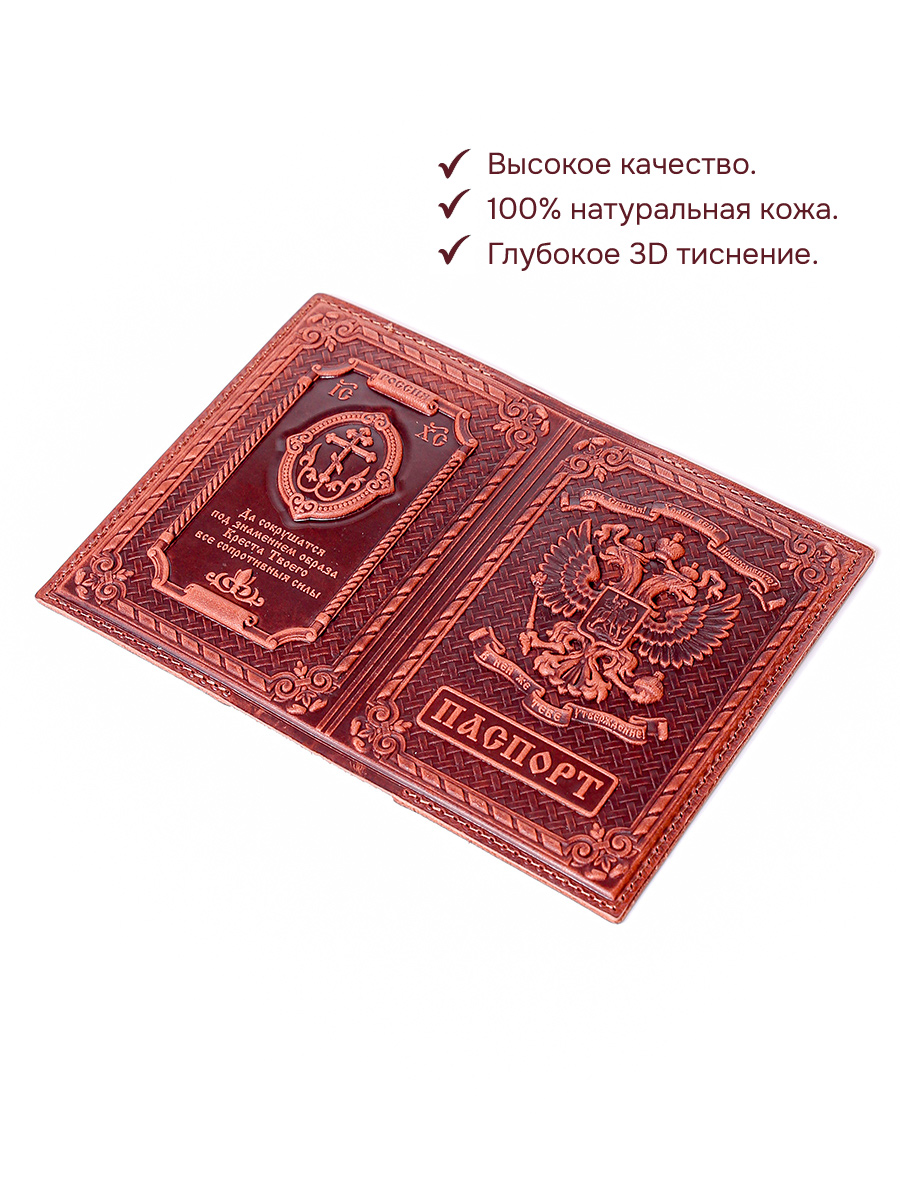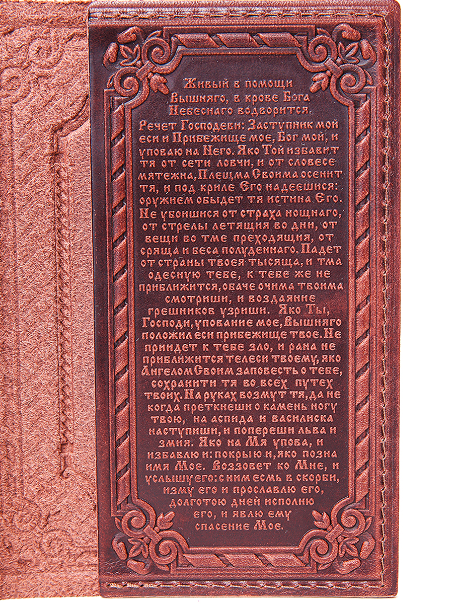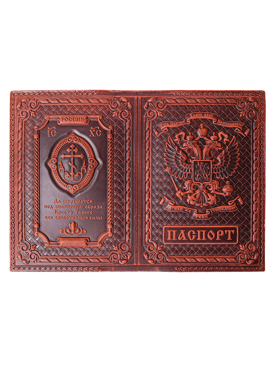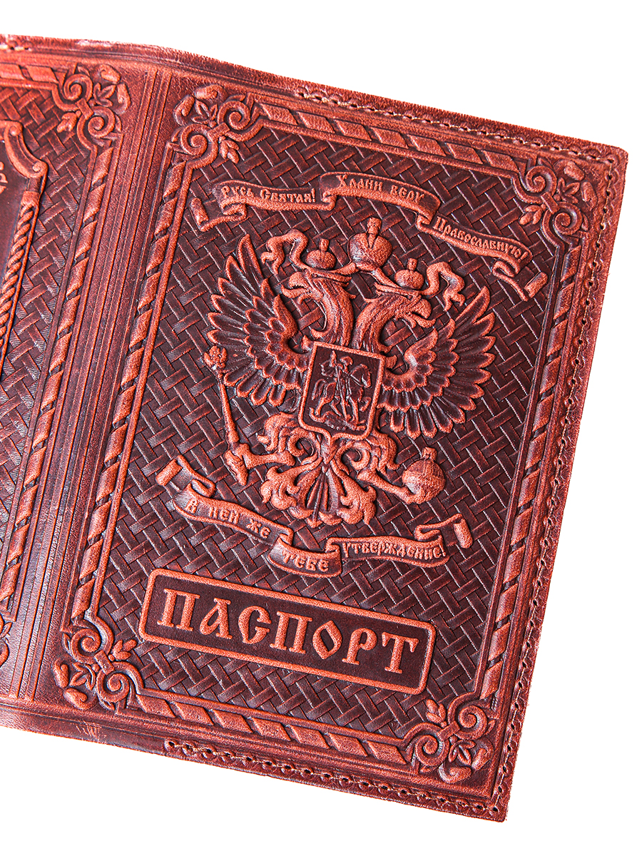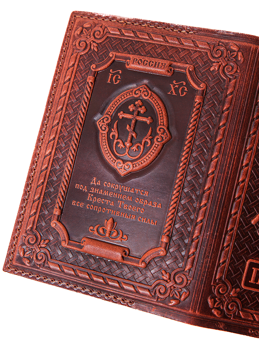 Православная обложка на паспорт из натуральной кожи с глубоким 3D тиснением. Изготовлена в России в православной мастерской. На обложке герб Российской Федерации с надписью: Русь святая храни веру православную! Также размещены молитва "Живый в помощи" и молитва Архангелу Михаилу. Нас также находят, как кожаная обложка для паспорта мужская женская с гербом РФ.