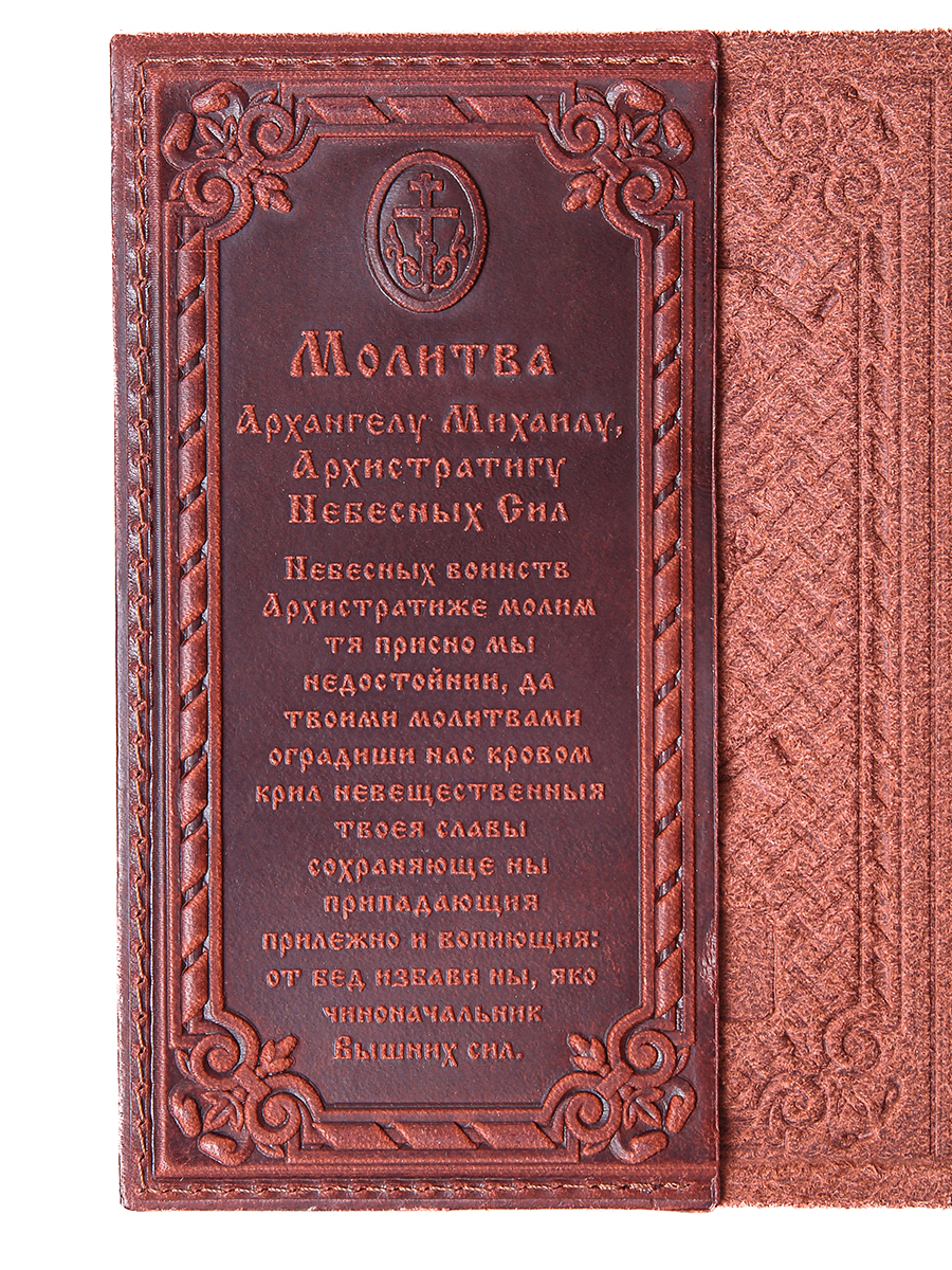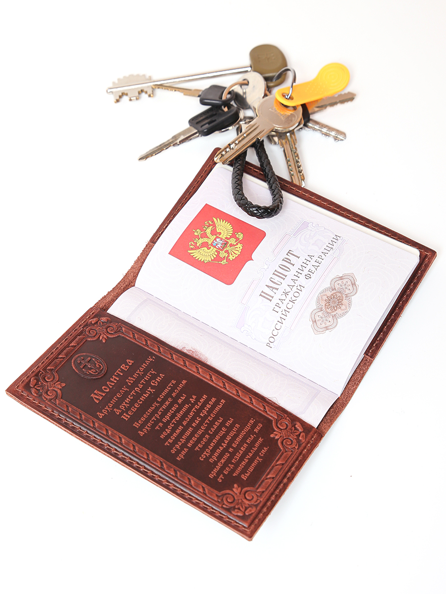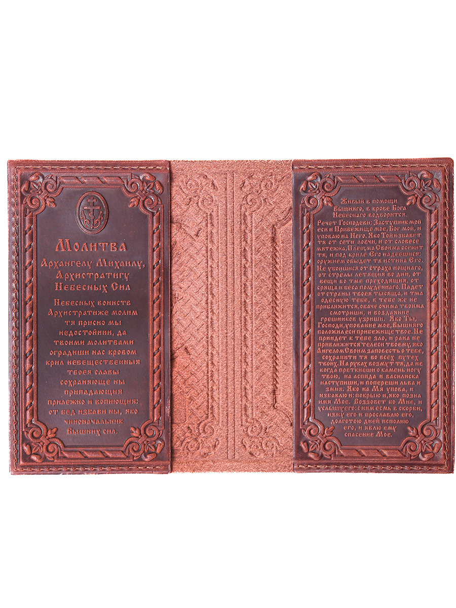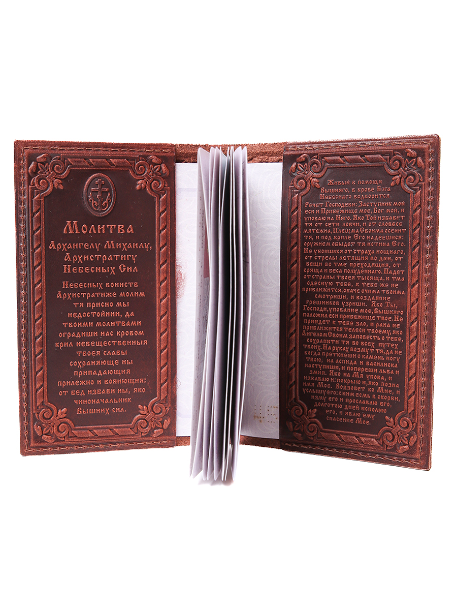 Православная кожаная обложка на паспорт с молитвами. Коричневая
