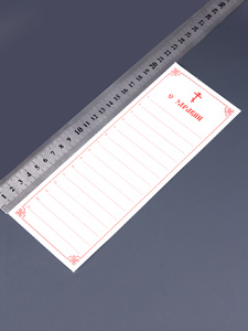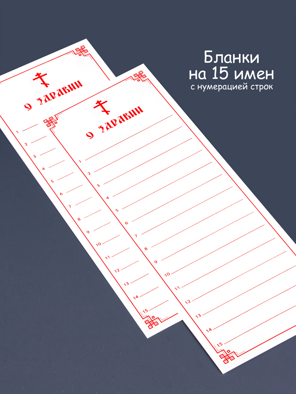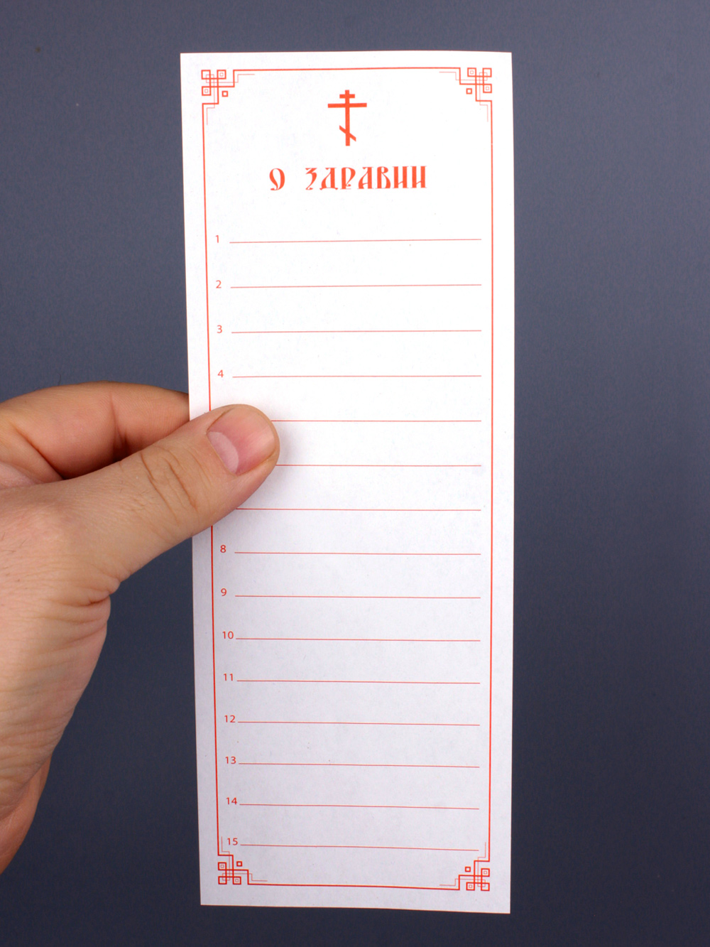 Бланки церковных записок "О здравии" на 15 имён. В коробке 250 шт. Размеры: 8 см х 21,5 см. Напечатаны на офсетной бумаге. Плотность бумаги 80 г/м2.