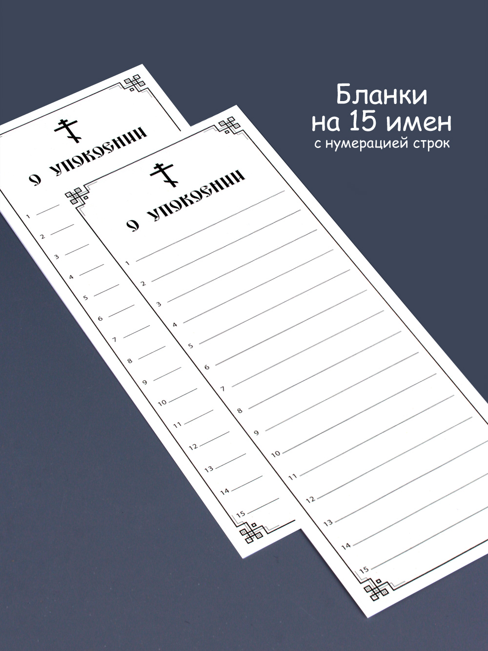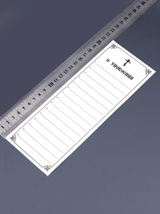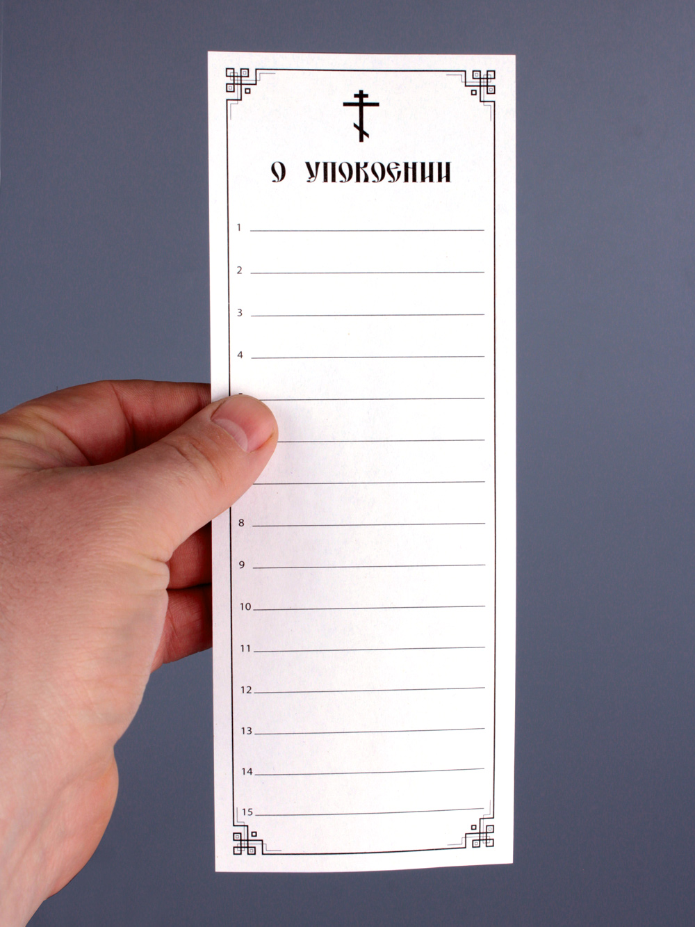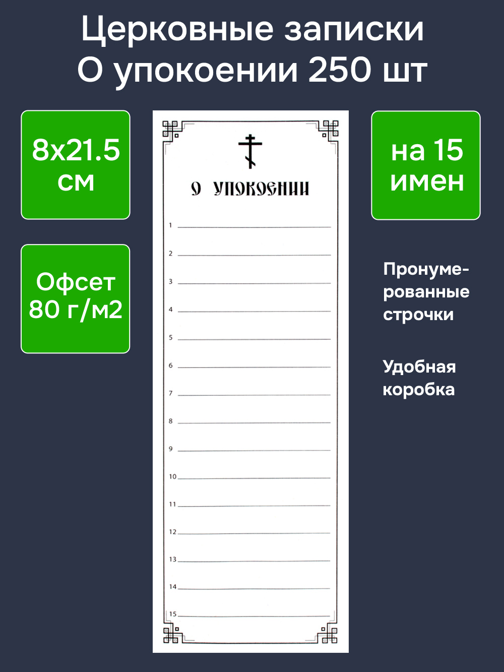 Бланки церковных записок "О упокоении" на 15 имён. В коробке 250 шт. Размеры: 8 см х 21,5 см. Напечатаны на офсетной бумаге. Плотность бумаги 80 г/м2.