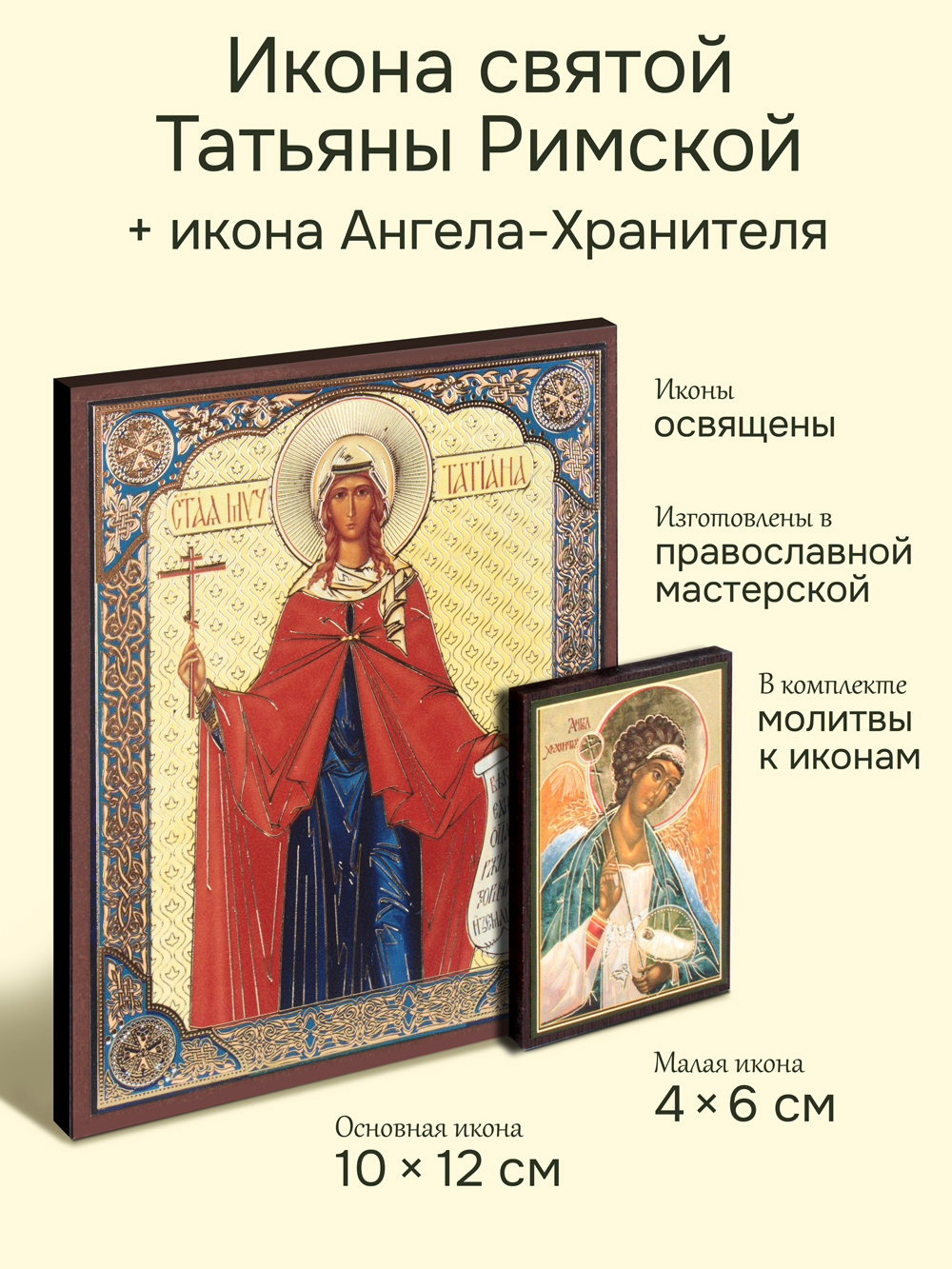 Предлагаем приобрести набор из двух освященных икон, который состоит из иконы святой мученицы Татьяны Римской и иконы Ангела-Хранителя.