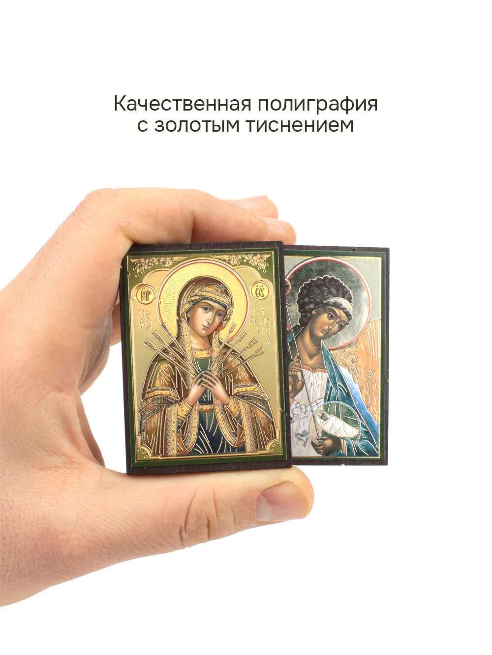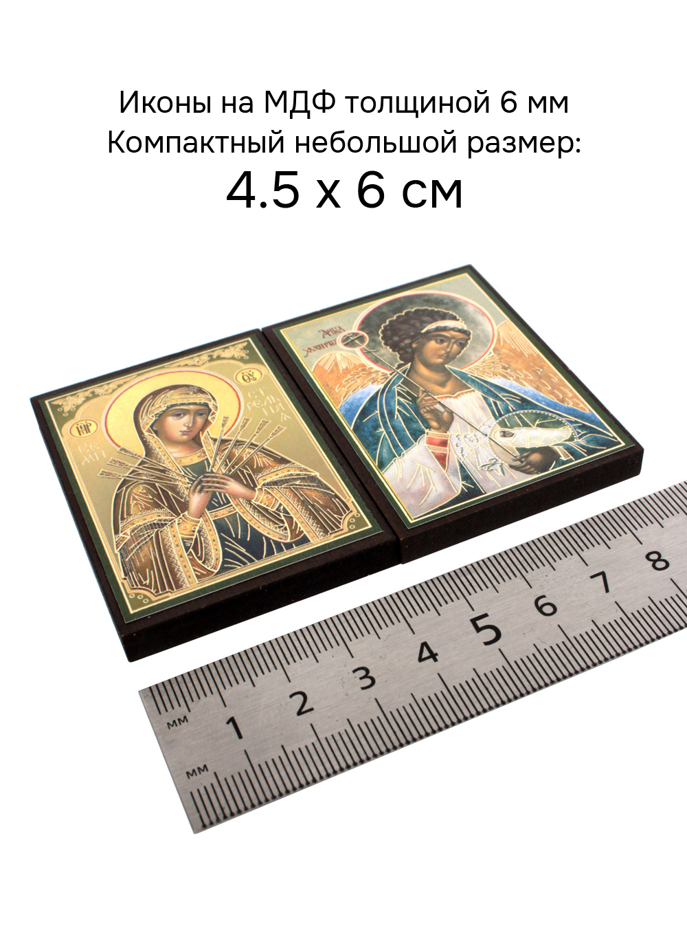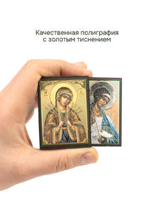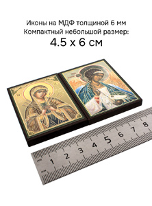 Иконы изготовлены на МДФ толщиной 6 мм. Размер иконы 4.5 x 6 см. Изображения икон выполнены с использованием полиграфической печати с золотым тиснением, дополнительно защищены ламинацией от внешних воздействий. Иконы отправляются в плотной коробке, что гарантирует их сохранность при транспортировке.