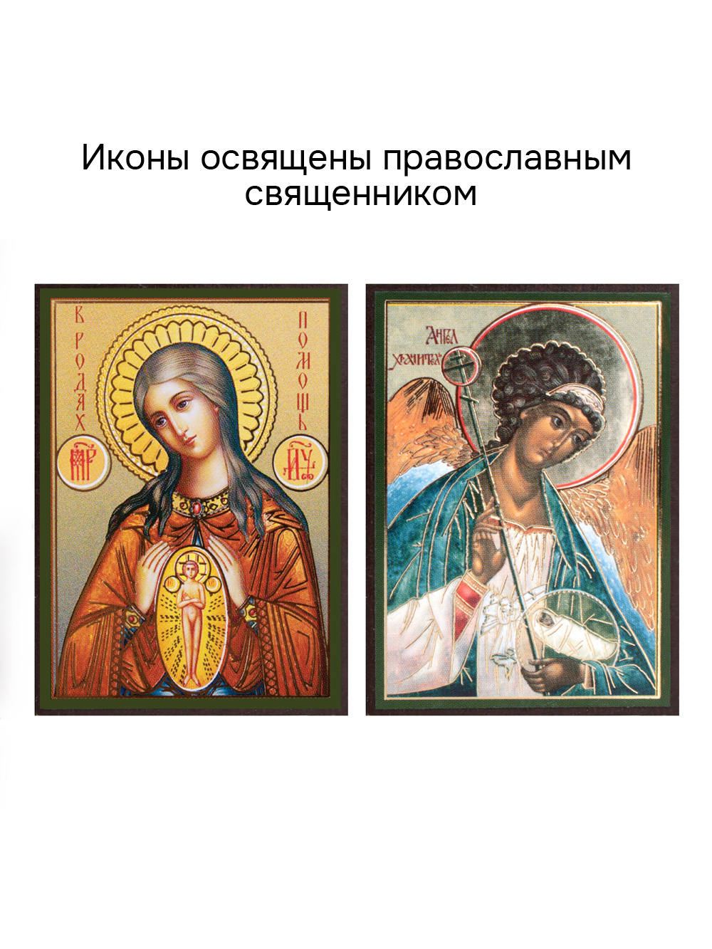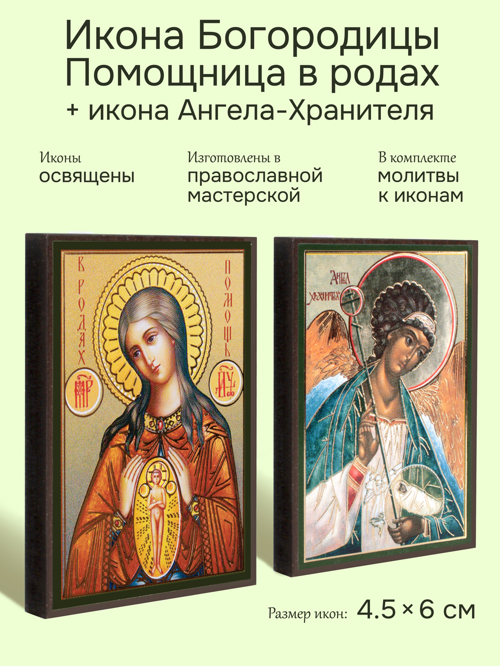 Предлагаем приобрести набор из двух освященных икон, который состоит из иконы Божией Матери "В родах Помощница" и иконы Ангела-Хранителя.