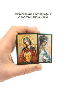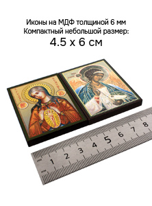 Иконы изготовлены на МДФ толщиной 6 мм. Размер основной иконы: 4.5 x 6 см, малой иконы Ангела-Хранителя: 4 x 6 см. Изображения икон выполнены с использованием полиграфической печати с золотым тиснением, дополнительно защищены ламинацией от внешних воздействий. Иконы отправляются в плотной коробке, что гарантирует их сохранность при транспортировке.