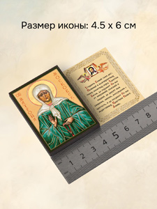 Икона изготовлена на МДФ толщиной 6 мм. Размер иконы: 4.5 x 6 см. Изображение иконы выполнено с использованием полиграфической печати с золотым тиснением, дополнительно защищены ламинацией от внешних воздействий.