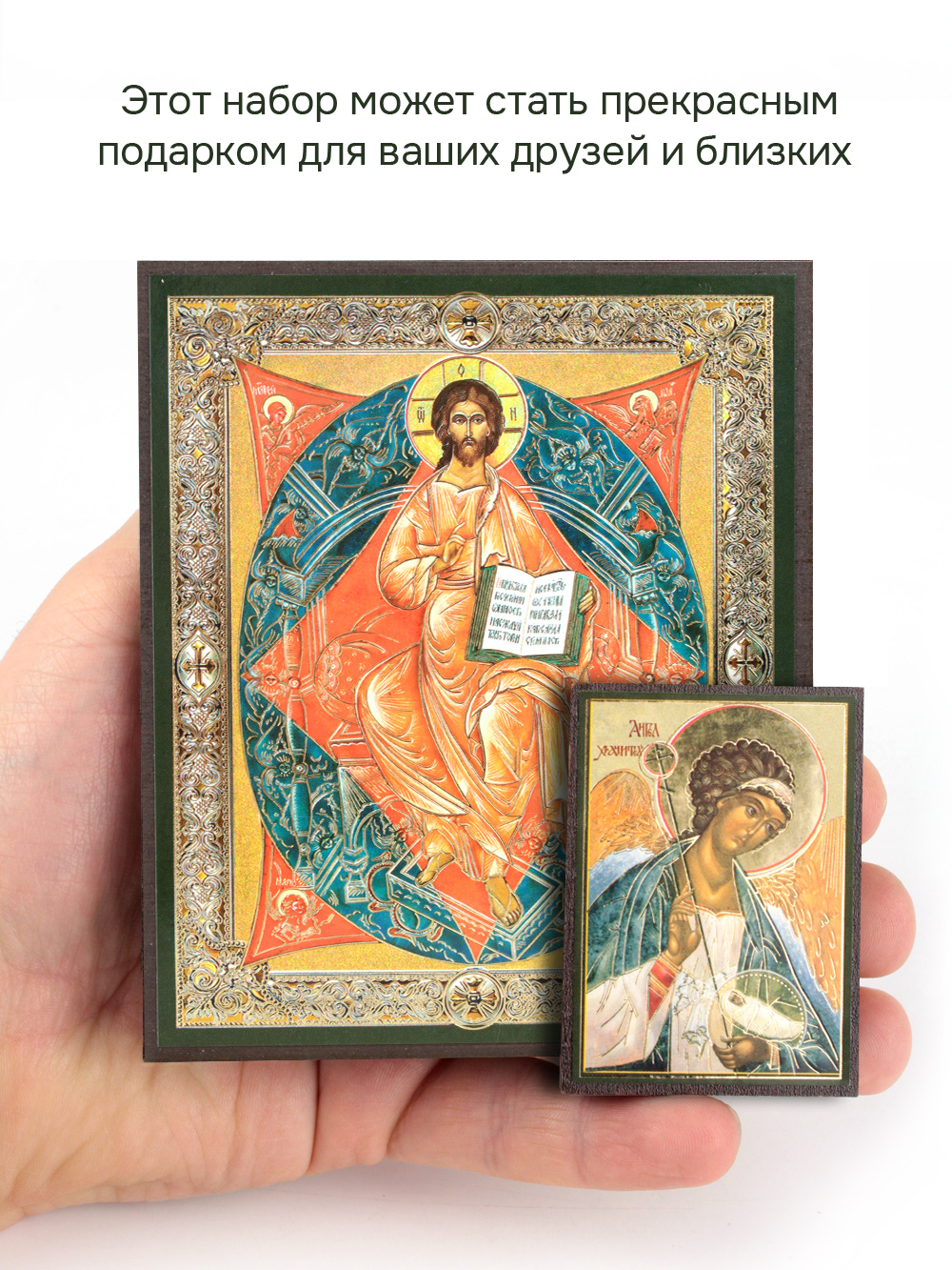 Предлагаем приобрести набор из двух освященных икон, который состоит из иконы Иисуса Христа: Спас в Силах и иконы Ангела-Хранителя.