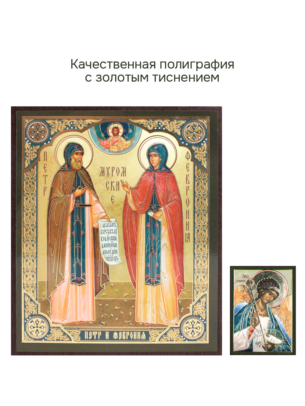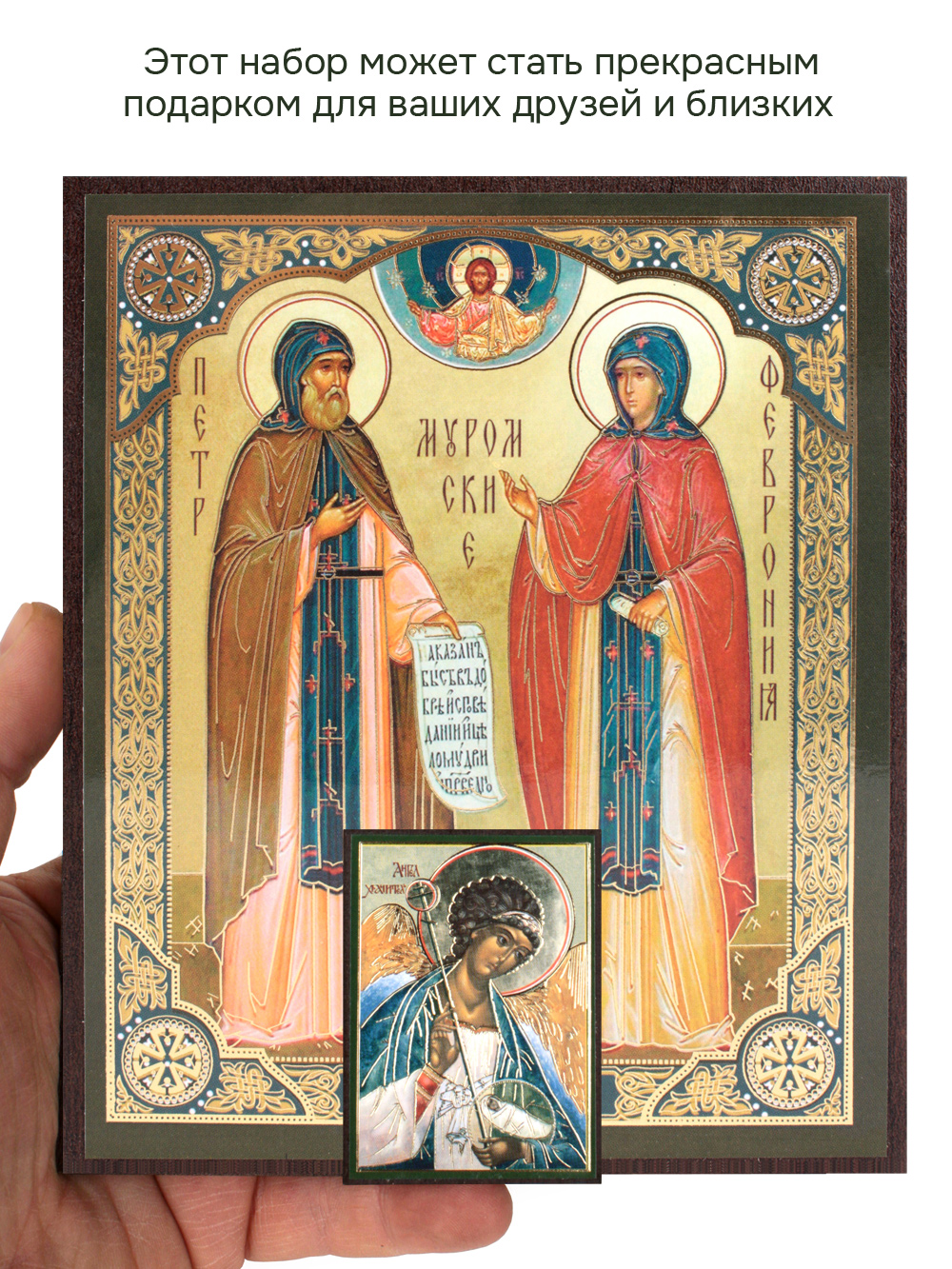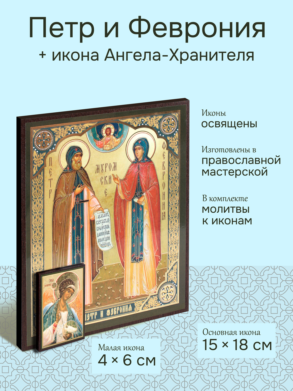 Предлагаем приобрести набор из двух освященных икон, который состоит из иконы "святых Петра и Февронии муромских" и иконы Ангела-Хранителя.