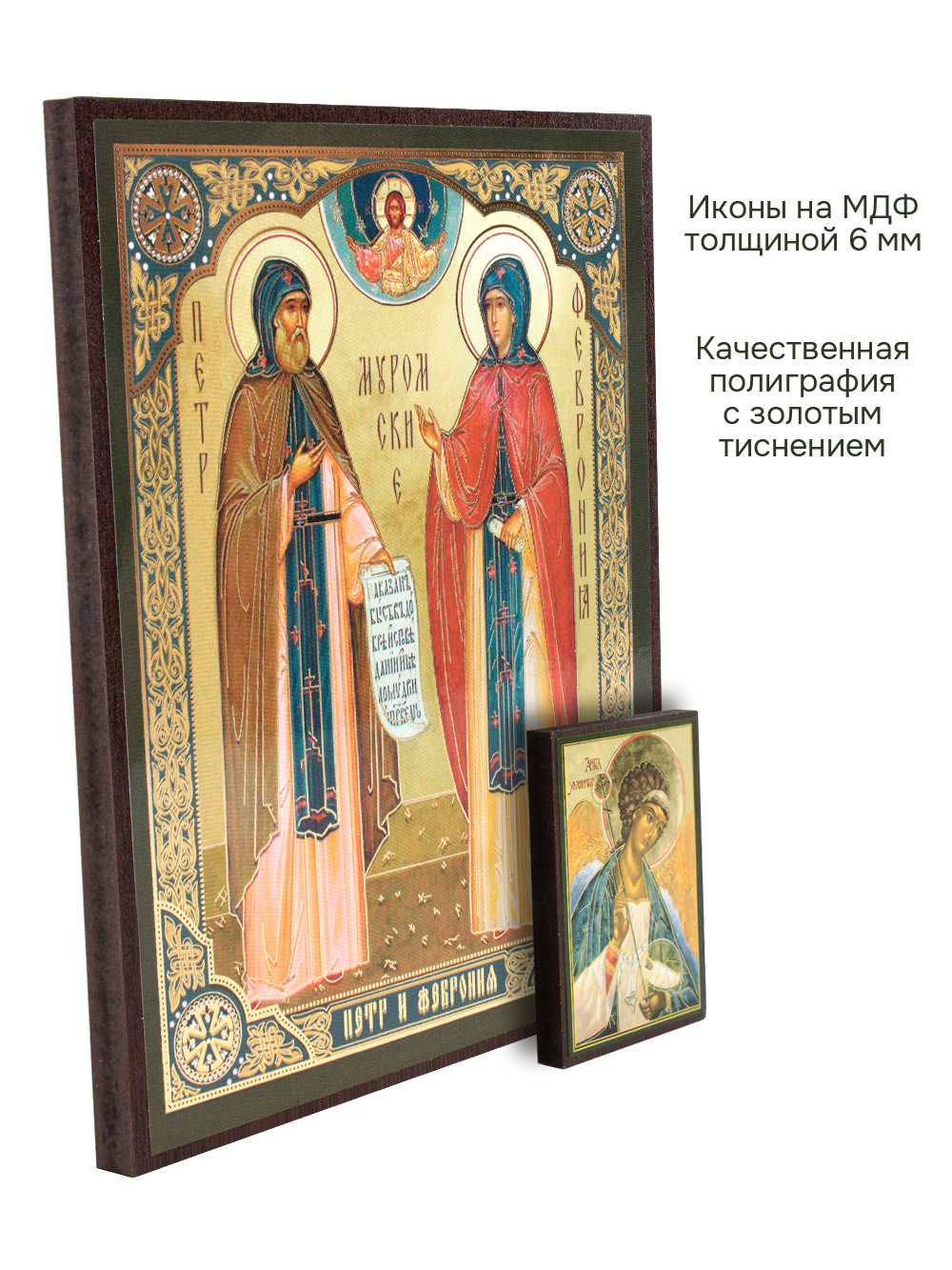 Иконы изготовлена на МДФ толщиной 6 мм. Размер основной иконы: 15 x 18 см, малой иконы Ангела-Хранителя: 4 x 6 см. Изображения икон выполнены с использованием полиграфической печати с золотым тиснением, дополнительно защищены ламинацией от внешних воздействий. Иконы отправляются в плотной коробке, что гарантирует их сохранность при транспортировке.