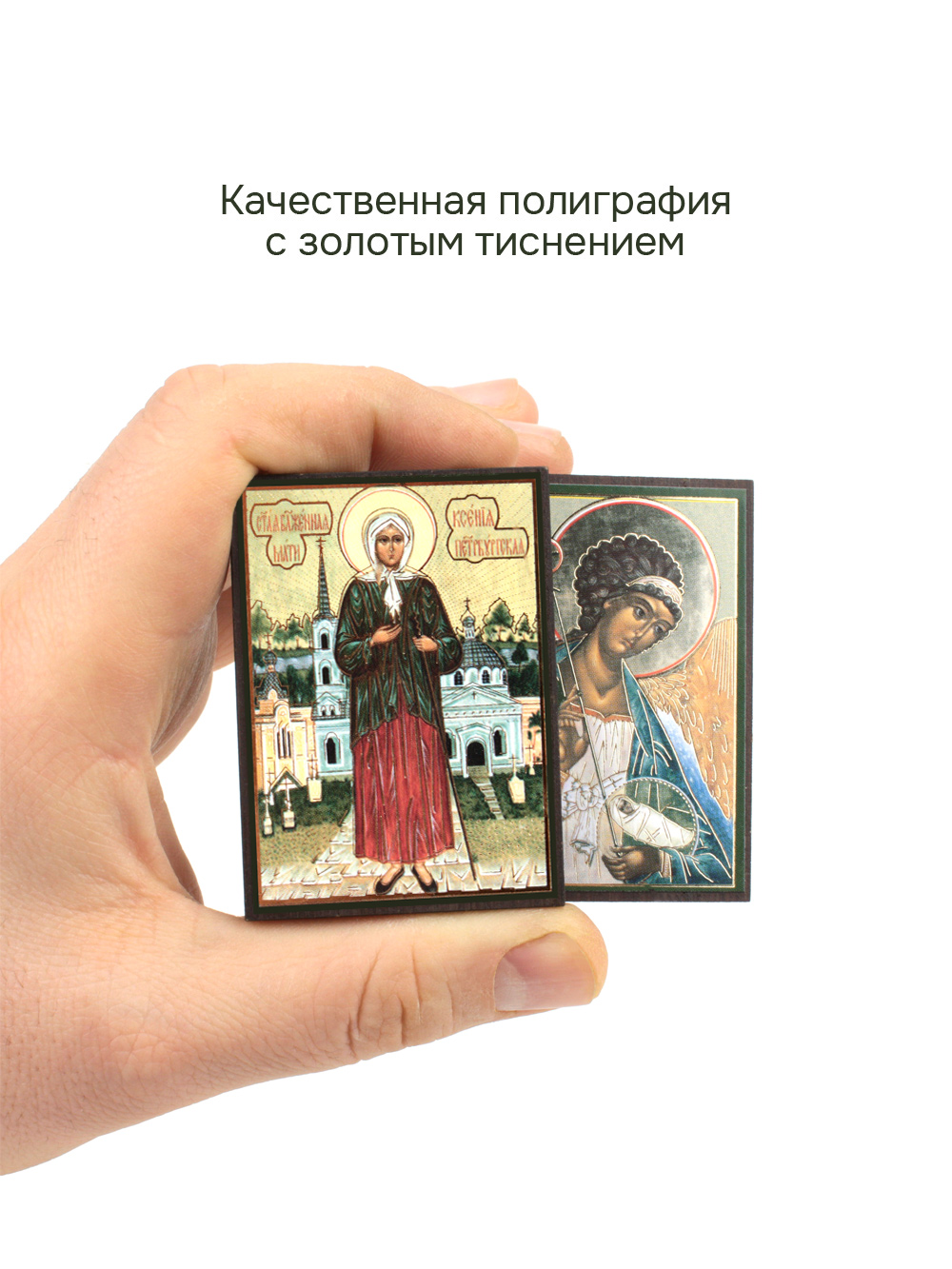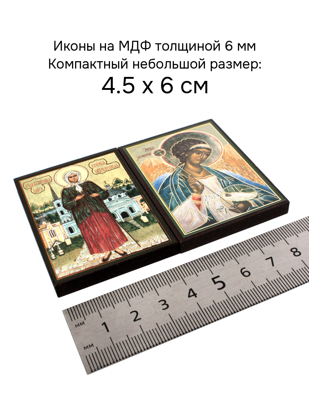 Иконы изготовлены на МДФ толщиной 6 мм. Размер икон: 4.5 x 6 см. Изображения икон выполнены с использованием полиграфической печати с золотым тиснением, дополнительно защищены ламинацией от внешних воздействий. Иконы отправляются в плотной коробке, что гарантирует их сохранность при транспортировке.