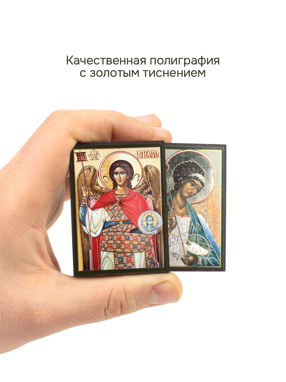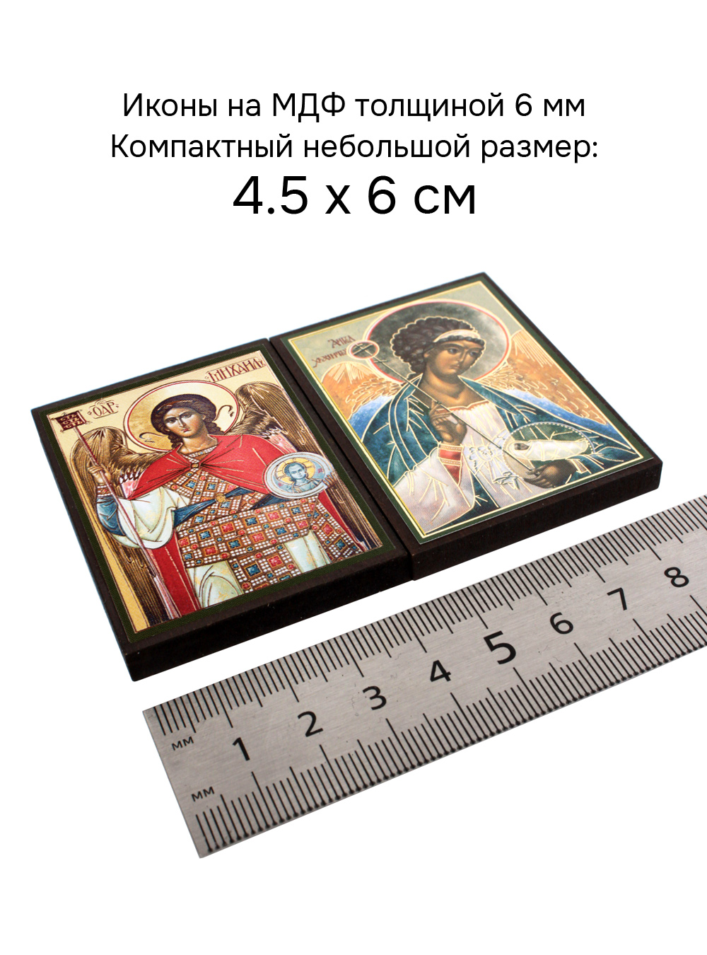 Иконы изготовлена на МДФ толщиной 6 мм. Размер икон: 4.5 x 6 см. Изображения икон выполнены с использованием полиграфической печати с золотым тиснением, дополнительно защищены. ламинацией от внешних воздействий. Иконы отправляются в плотной коробке, что гарантирует их сохранность при транспортировке.