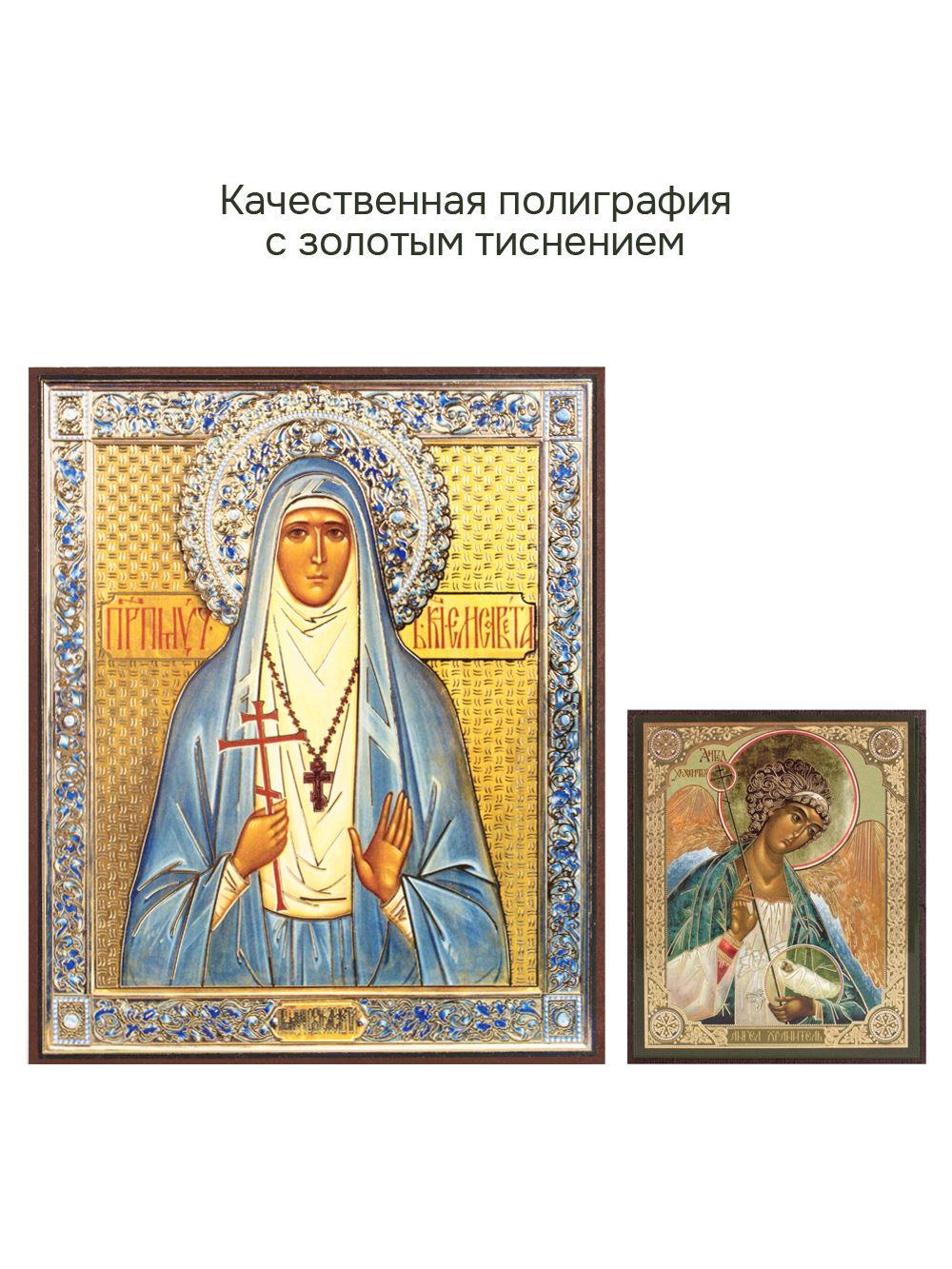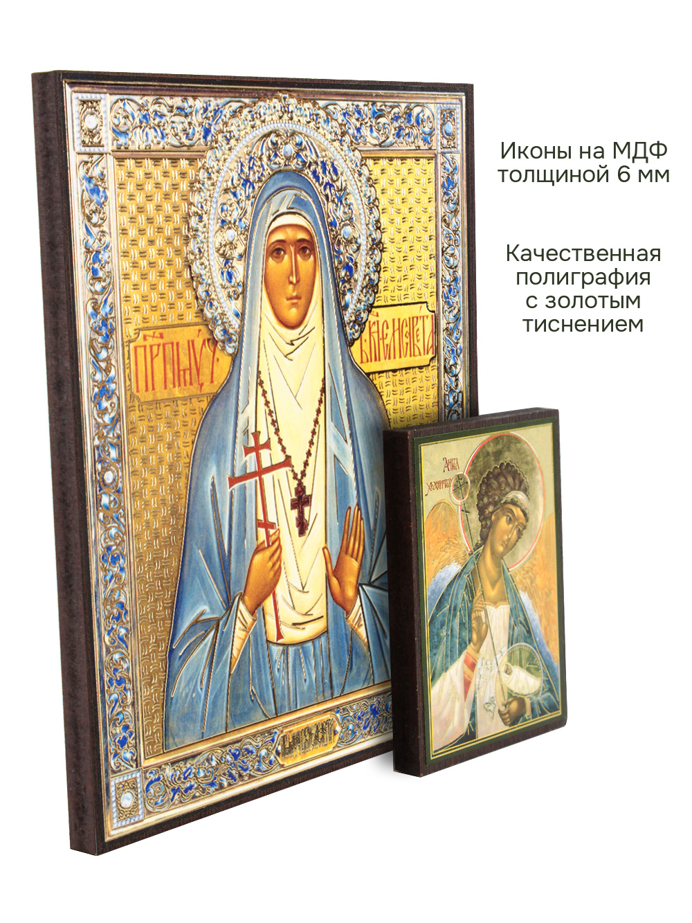 Иконы изготовлены на МДФ толщиной 6 мм. Размер основной иконы: 10.5 x 12.5 см, малой иконы Ангела-Хранителя: 4 x 6 см. Изображения икон выполнены с использованием полиграфической печати с золотым тиснением, дополнительно защищены ламинацией от внешних воздействий. Иконы отправляются в плотной коробке, что гарантирует их сохранность при транспортировке.