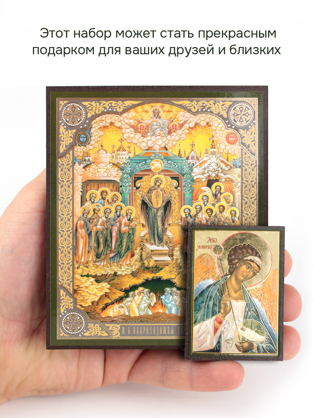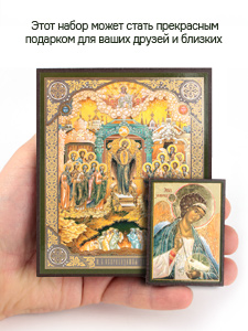 Предлагаем приобрести набор из двух освященных икон, который состоит из иконы Пресвятой Богородицы Непроходимая дверь и иконы Ангела-Хранителя.