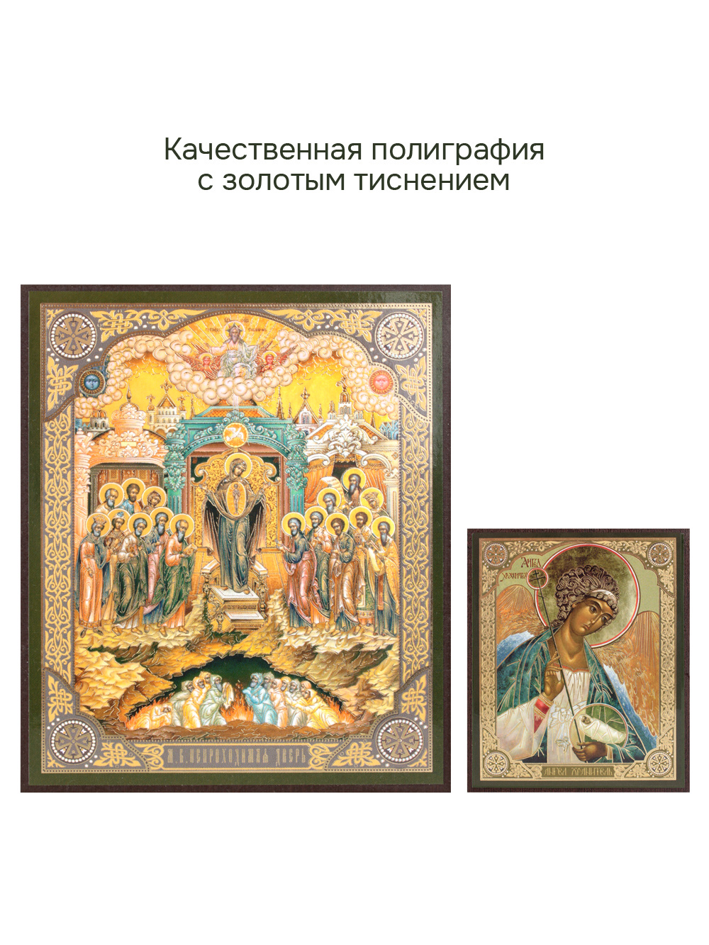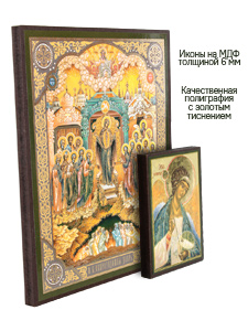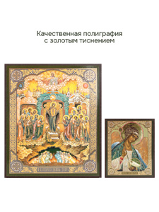 Иконы изготовлены на МДФ толщиной 6 мм. Размер основной иконы: 10.5 x 12.5 см, малой иконы Ангела-Хранителя: 4 x 6 см. Изображения икон выполнены с использованием полиграфической печати с золотым тиснением, дополнительно защищены ламинацией от внешних воздействий. Иконы отправляются в плотной коробке, что гарантирует их сохранность при транспортировке.