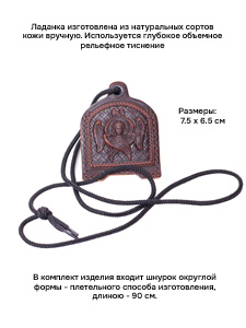 Ладанка изготовлена из натуральных сортов кожи вручную. Используется глубокое объемное рельефное тиснение. Изделие выполнено в форме кармашка и предназначается для хранения или ношения на себе небольших святынь. На лицевой стороне Ладанки располагается изображение Херувима, с обратной стороны - православный крест. Размеры: Длина - 7.5см; Ширина - 5.5 см; Толщина - до 0.6 см. В комплект изделия входит шнурок округлой формы - плетельного способа изготовления, длиною - 90 см.