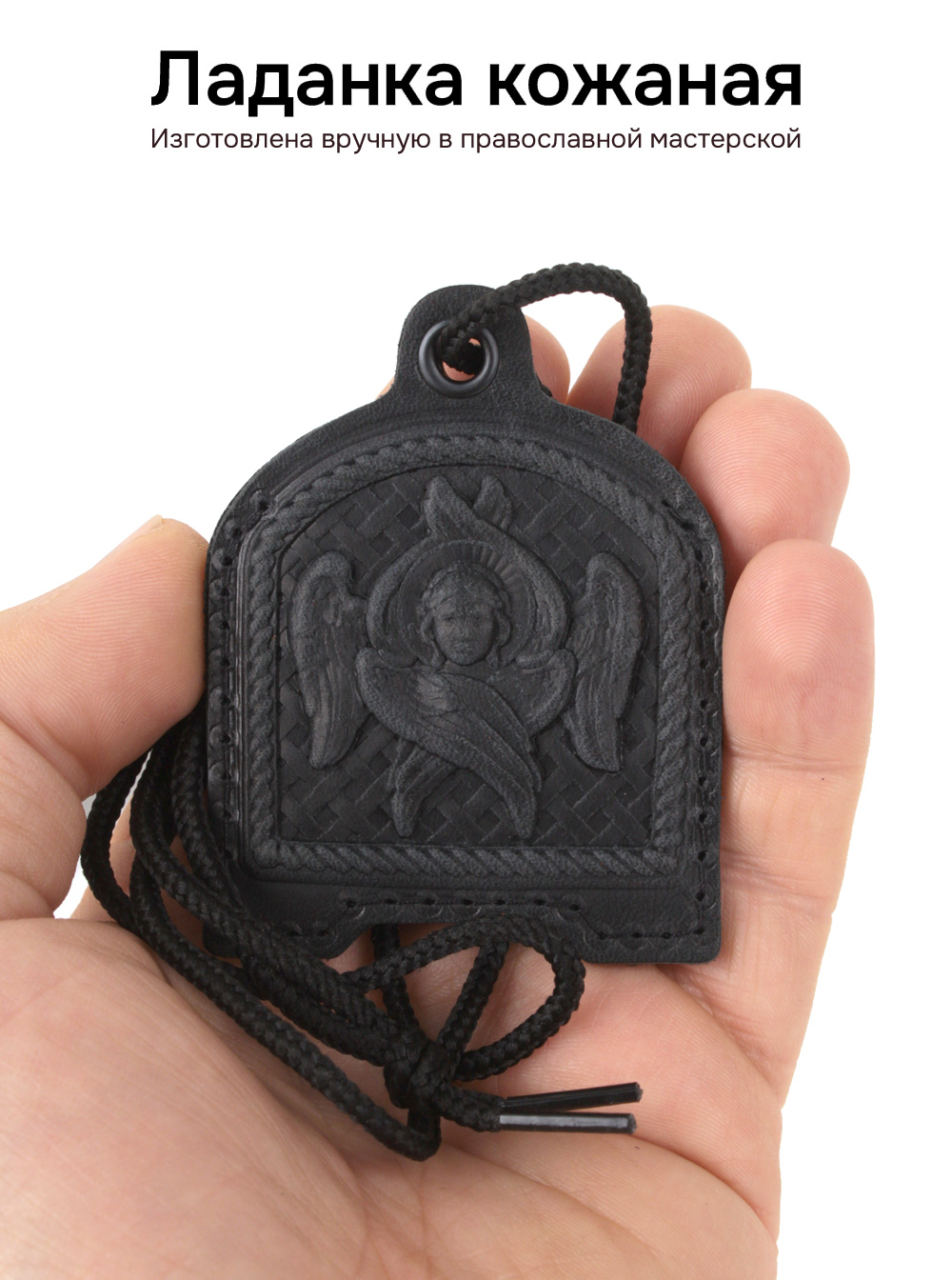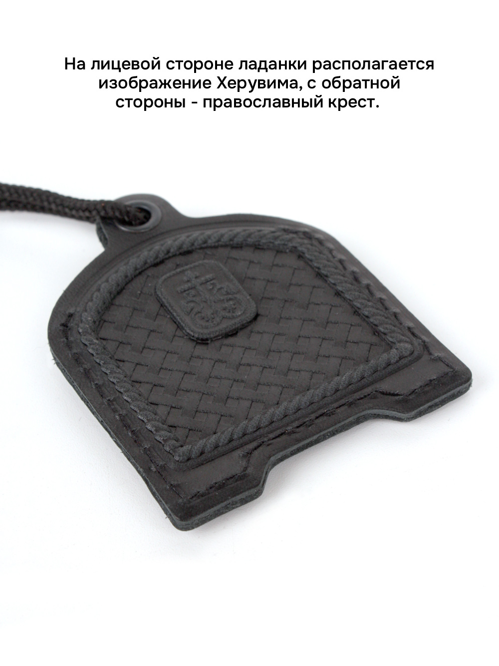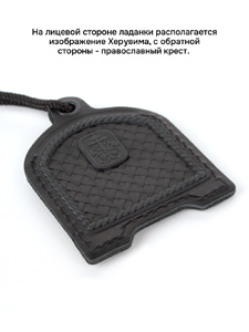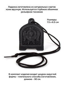 Ладанка изготовлена из натуральных сортов кожи вручную. Используется глубокое объемное рельефное тиснение. Изделие выполнено в форме кармашка и предназначается для хранения или ношения на себе небольших святынь. На лицевой стороне Ладанки располагается изображение Херувима, с обратной стороны - православный крест. Размеры: Длина - 7.5см; Ширина - 5.5 см; Толщина - до 0.6 см. В комплект изделия входит шнурок округлой формы - плетельного способа изготовления, длиною - 90 см.