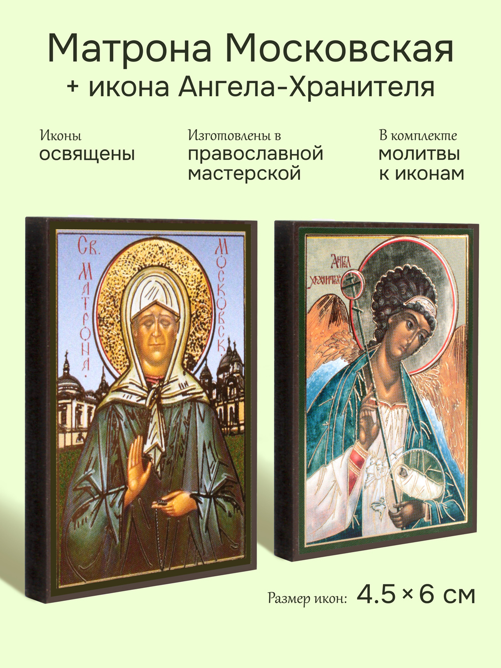 Предлагаем приобрести набор из двух освященных икон, который состоит из иконы блаженной матроны Московской и иконы Ангела-Хранителя.