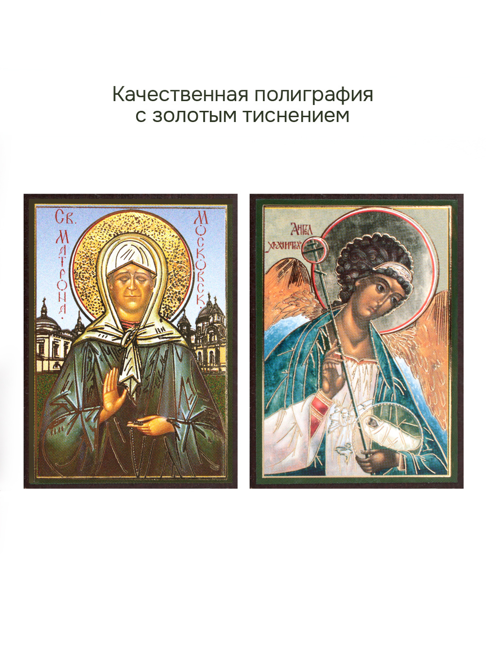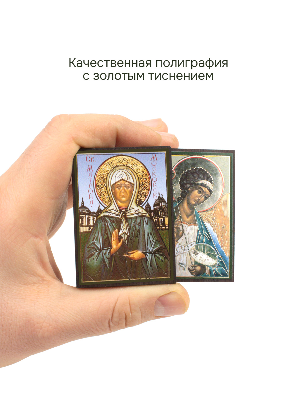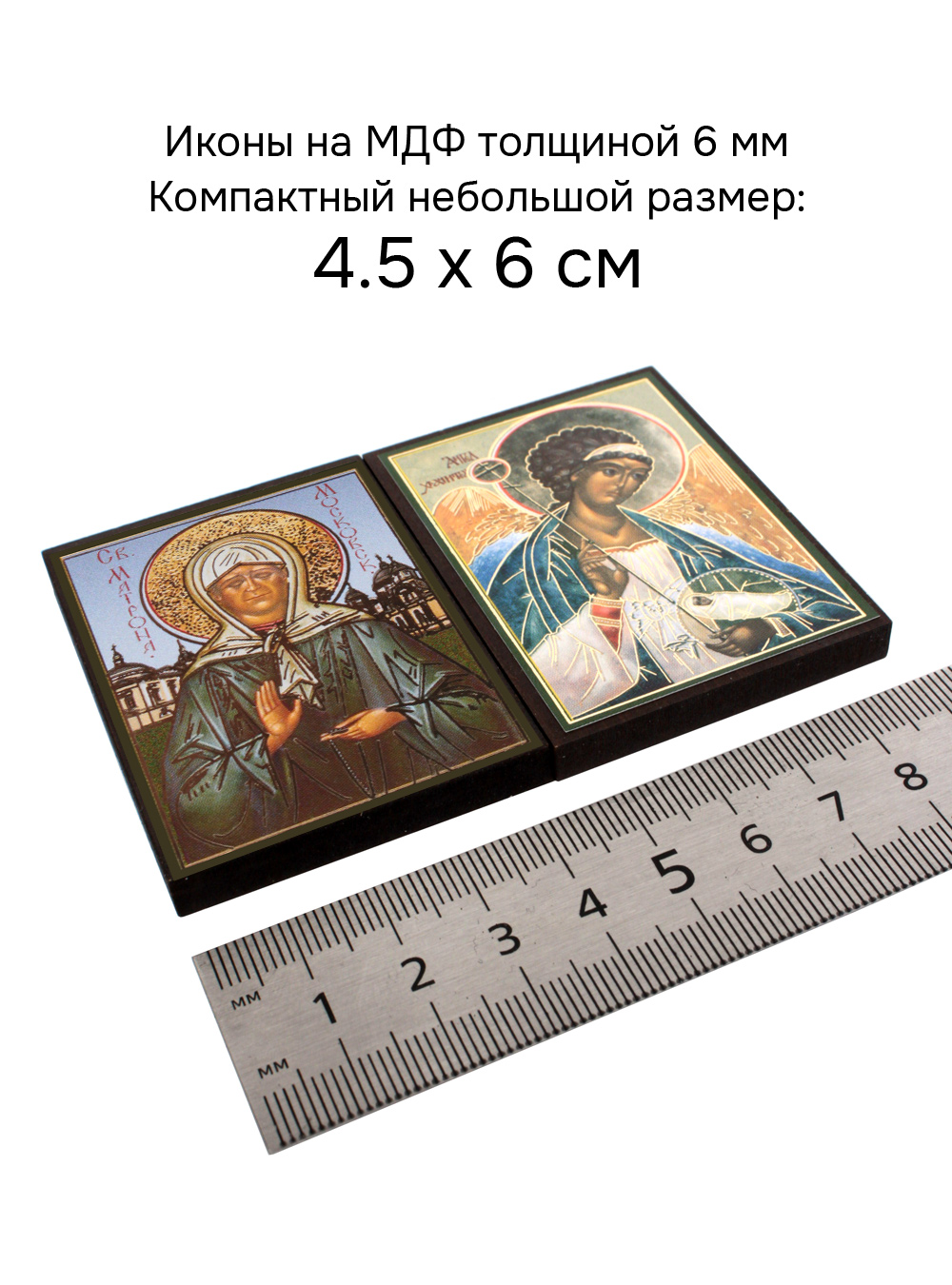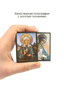Иконы изготовлены на МДФ толщиной 6 мм. Размер икон: 4.5 x 6 см. Изображения икон выполнены с использованием полиграфической печати с золотым тиснением, дополнительно защищены ламинацией от внешних воздействий. Иконы отправляются в плотной коробке, что гарантирует их сохранность при транспортировке.