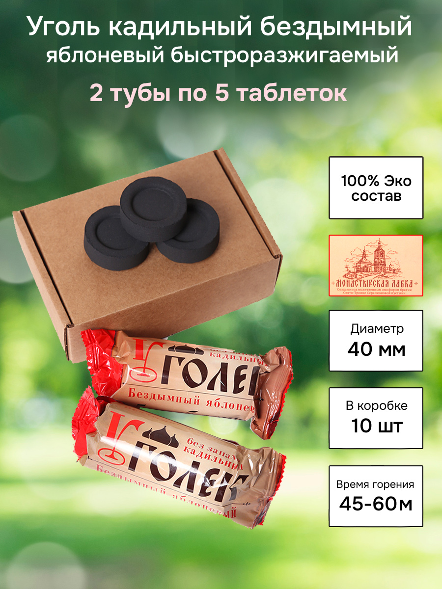Уголь кадильный бездымный яблоневый диаметром 40 мм. 2 тубы по 5 таблеток, т.е. всего 10 шт.