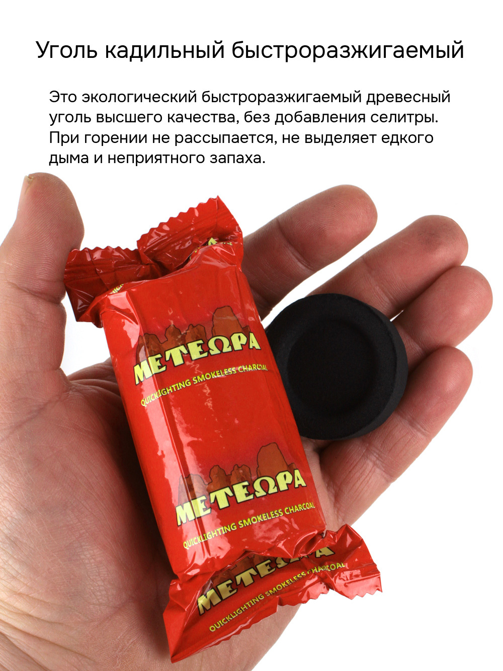 Уголь кадильный бездымный греческий диаметром 40 мм. 1 туба с 10 таблетками. Время розжига составляет не более 10 секунд. Тлеет до 45 - 60 минут. Постоянное улучшение качества и применение новейших экспертных технологий позволили создать экологически чистый, быстроразжигаемый продукт без вредной селитры, едкого дыма и неприятного запаха. В его состав входит сырье яблоневого дерева, что позволяет углю иметь великолепную теплоотдачу, устойчивый мягкий жар и увеличенное время тления угля. Все вышеперечисленные характеристики позволяют использовать уголек в помещении без ущерба для здоровья. После розжига легкий и плотный продукт, с равномерной консистенцией, ведет себя безупречно - нет каких либо неприятных запахов, тлеет равномерно, не трещит, не искрится и не рассыпается, не обладает повышенной зольностью. Способы применения: 1. С помощью кадильницы: кадильница - это металлическая или керамическая емкость, в которую помещается раскаленный уголек. Поджигаем его и ждем около 10 - 20 секунд. Для розжига лучше всего использовать металлическую подставку или специальные щипцы. Уголь должен покрыться белым пепелком. Когда он разогрелся кладем его в кадильницу и насыпаем немного ладана или благовоний в виде смолы вокруг, и он сразу начинает выделять ароматный дым.