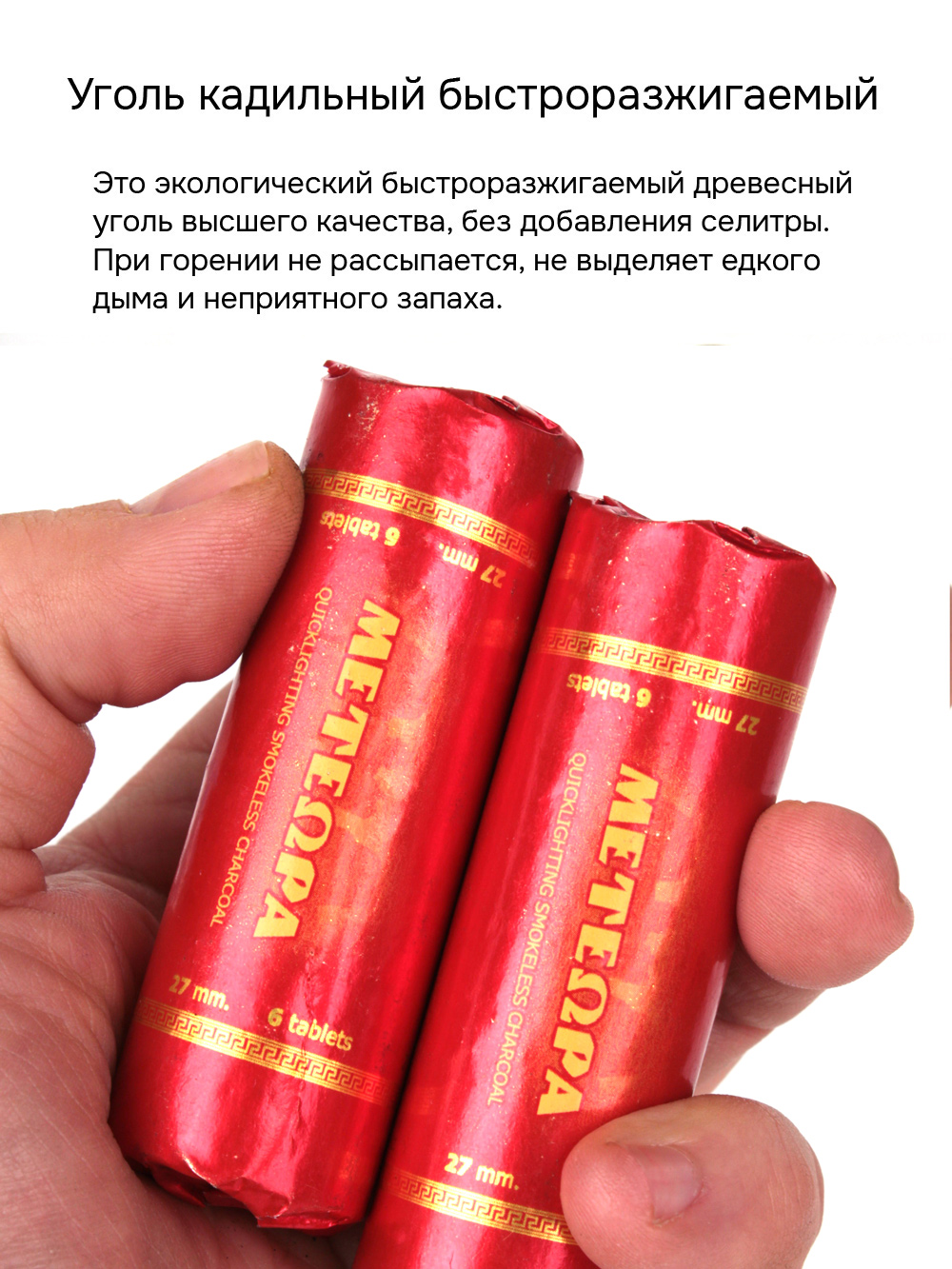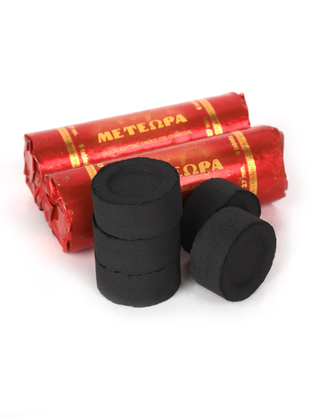 Уголь кадильный бездымный греческий диаметром 27 мм. 2 тубы с 6 таблетками. Время розжига составляет не более 10 секунд. Тлеет до 30 - 45 минут. Постоянное улучшение качества и применение новейших экспертных технологий позволили создать экологически чистый, быстроразжигаемый продукт без вредной селитры, едкого дыма и неприятного запаха. В его состав входит сырье яблоневого дерева, что позволяет углю иметь великолепную теплоотдачу, устойчивый мягкий жар и увеличенное время тления угля. Все вышеперечисленные характеристики позволяют использовать уголек в помещении без ущерба для здоровья. После розжига легкий и плотный продукт, с равномерной консистенцией, ведет себя безупречно - нет каких либо неприятных запахов, тлеет равномерно, не трещит, не искрится и не рассыпается, не обладает повышенной зольностью. Способы применения: 1. С помощью кадильницы: кадильница - это металлическая или керамическая емкость, в которую помещается раскаленный уголек. Поджигаем его и ждем около 10 - 20 секунд. Для розжига лучше всего использовать металлическую подставку или специальные щипцы. Уголь должен покрыться белым пепелком. Когда он разогрелся кладем его в кадильницу и насыпаем немного ладана или благовоний в виде смолы вокруг, и он сразу начинает выделять ароматный дым.