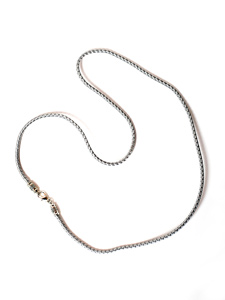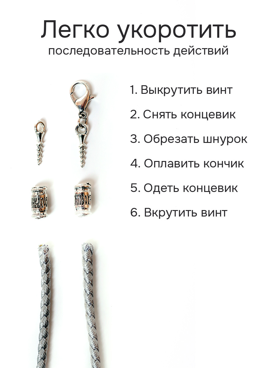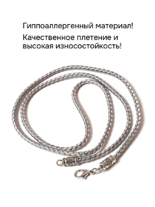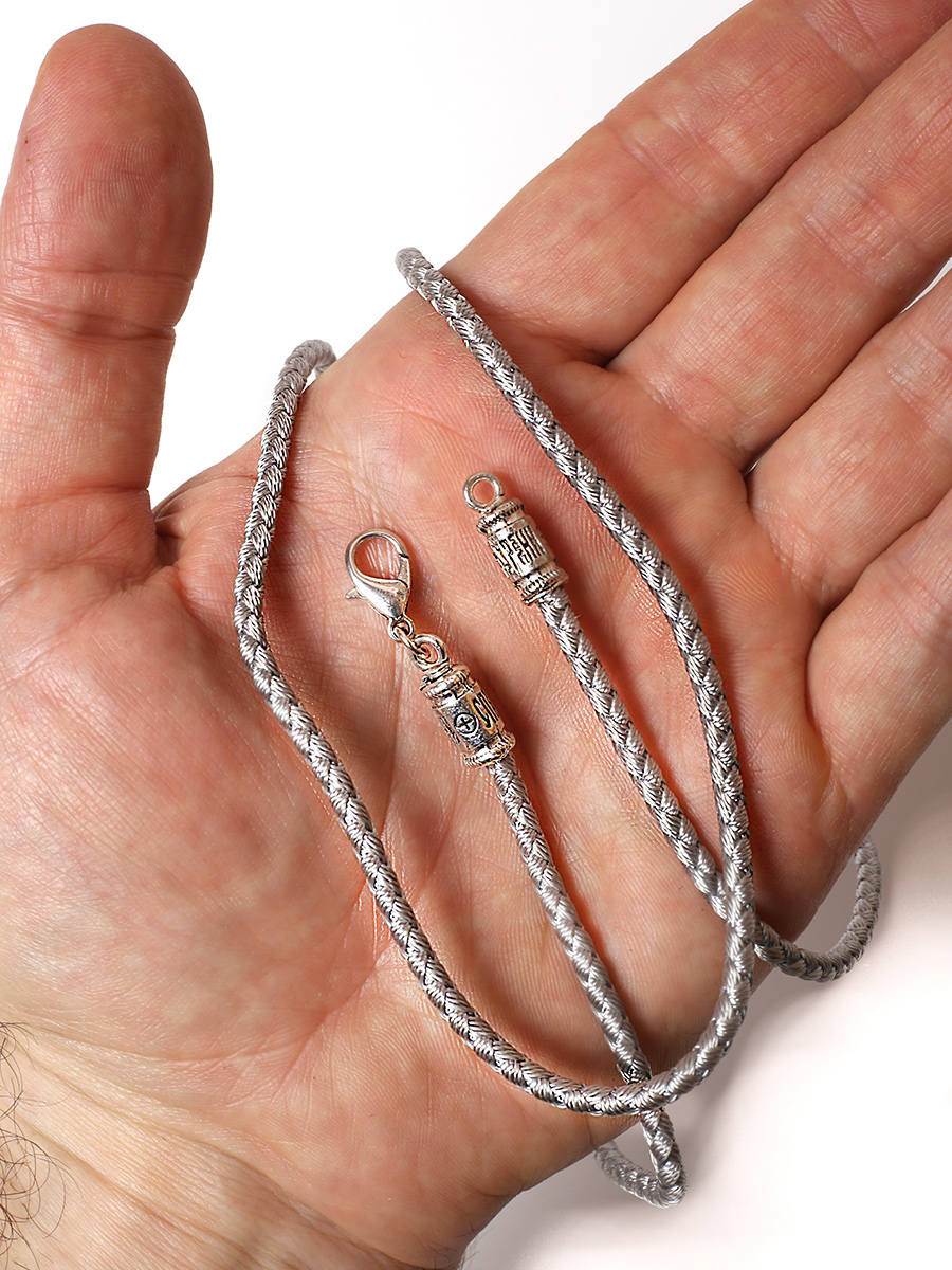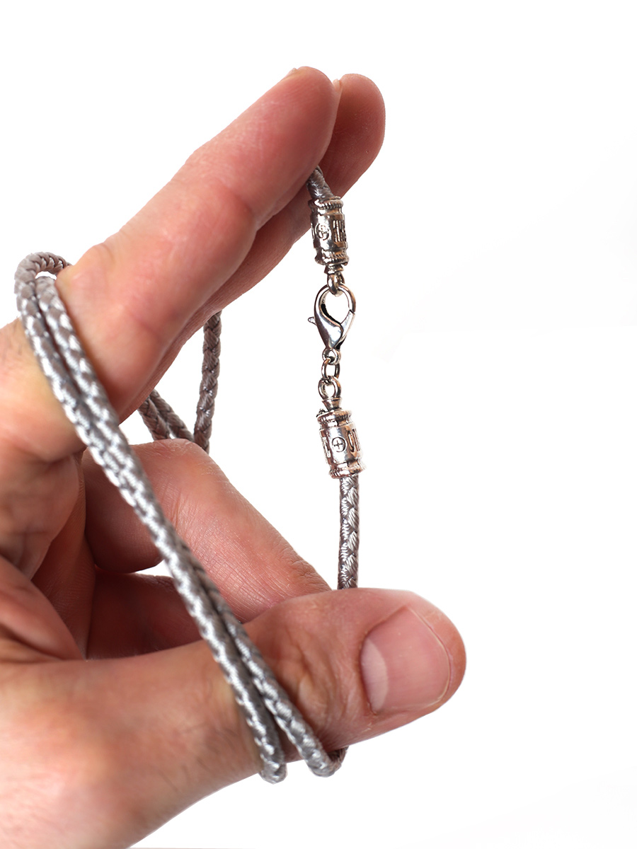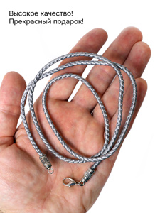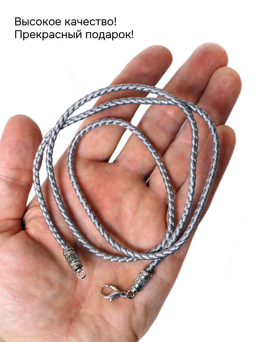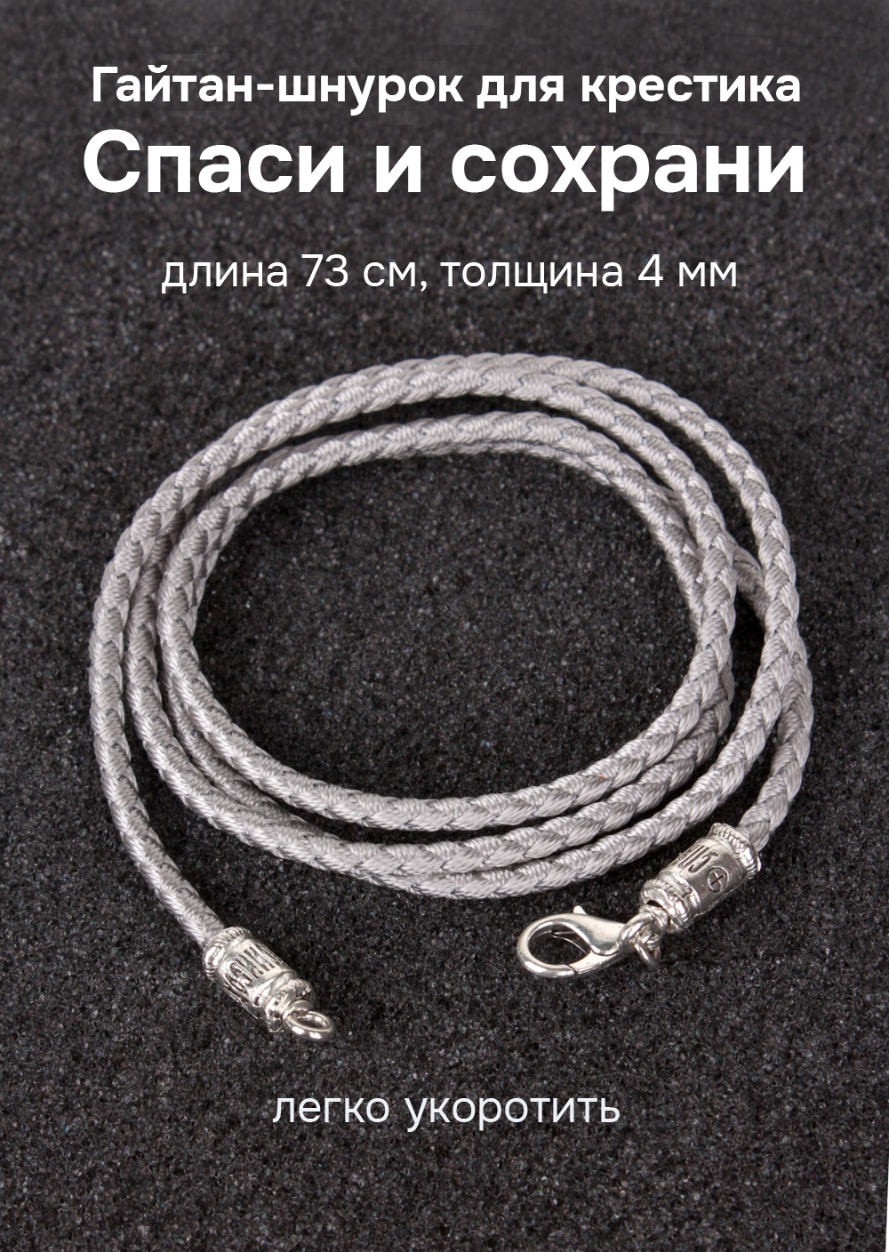 Православный Гайтан-шнурок для крестика с молитвой "Спаси и Сохрани" на концевиках. Шнурок имеет длину 73 см и диаметр 4 мм. Гайтан для крестика имеет высококачественное плетение шелковых серебристых нитей. Веревочку для крестика можно легко снимать и надевать с шеи благодаря замочку. Гайтан можно укоротить на необходимую длину. Для этого нужно выкрутить один из двух винтов, снять концевик, укоротить шнур, опалить отрезанный кончик, поставить концевик обратно и вкрутить винт. Также снятие концевика позволяет продеть в гайтан подвеску, кулон или крестик.